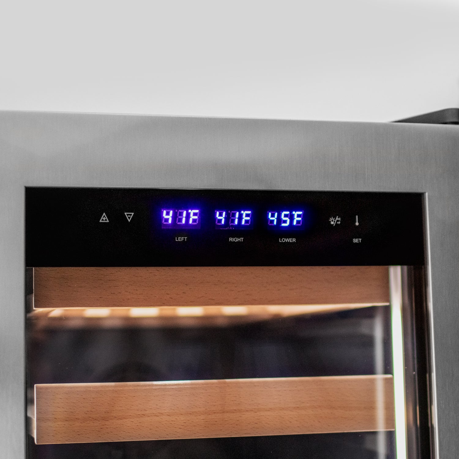 • LED display control panel allows you to precisely control each zone independently; Two wine zones: 41-64°F | Beverage Drawers 37-64°F
