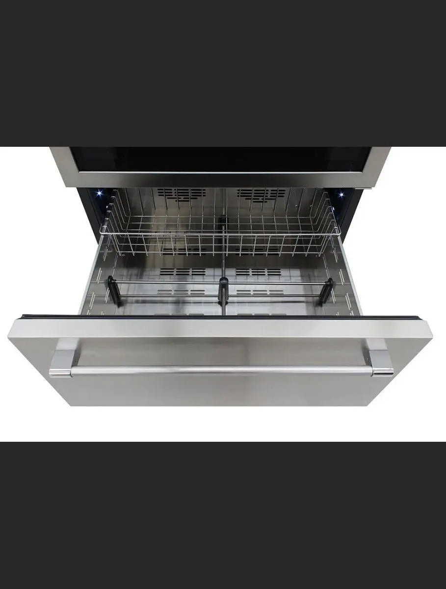 The new EL-BWC30TB-S Wine Cooler & Drawer brings an element of class and elegance to any room. This premium wine & beverage cooler will allow you to store your collection in the optimal conditions so that your favorite wine and beverages can be kept at respective temperatures. An easy-to-use digital control panel with LED readout allows you to set the individual cooling zones at three different temperatures to ensure that your goodies, wine bottles and beverage cans are maintained properly. This unit features the glass door with pole handle in the upper section for wine storage and two drawers with stainless steel exterior and horizontal handle in the lower section for beverage storage. Gliding metal wire racks with 53mm high wooded lip, stainless steel drawers and glass door give a stylish look to this unit while providing you with easy access to your favorite wine and beverages. This attractive and modern Wine Cooler & Drawer is designed to be a worthy home for all of your finest collections.