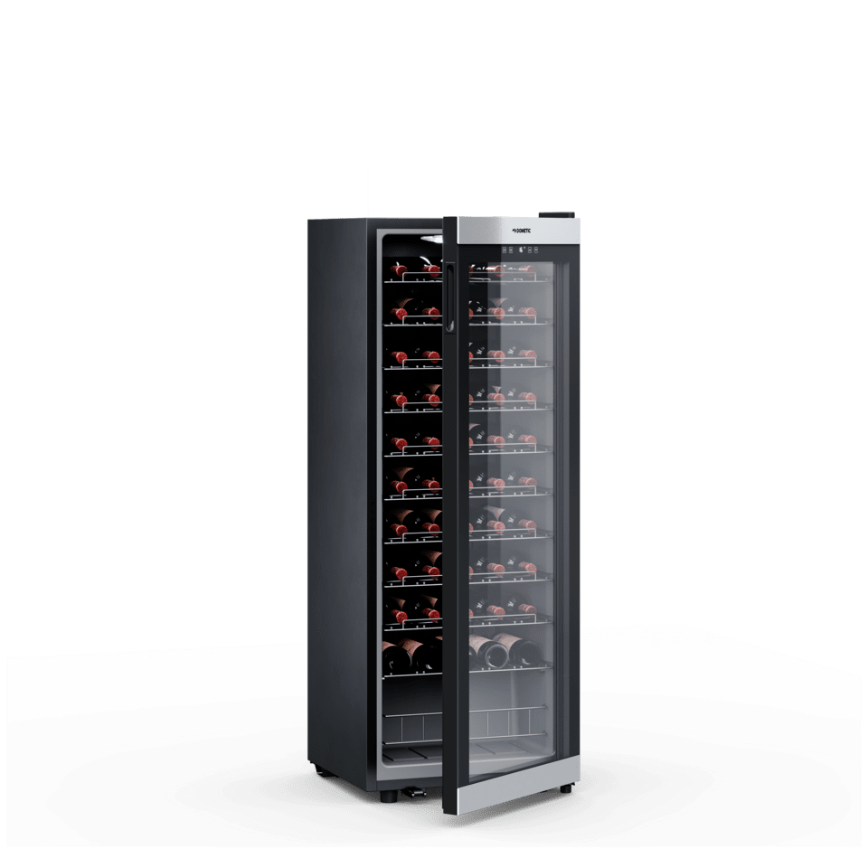 This single-zone wine cooler is a beautiful addition to any home, restaurant or hotel bar. It has room for 55 Bordeaux bottles – attractively presented behind a 3-layer glass door and softly illuminated with a white interior light. Suitable for freestanding use.
