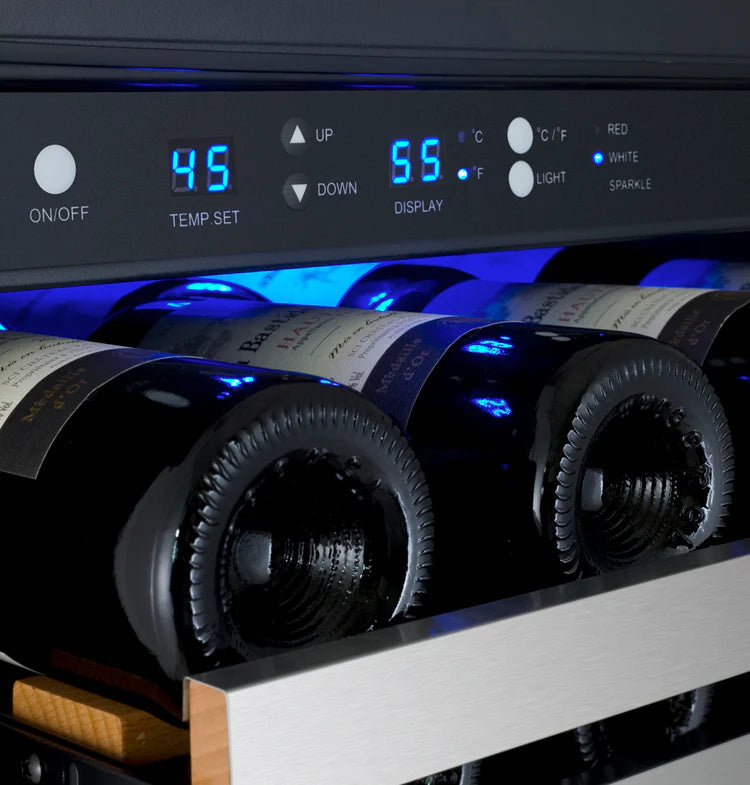 The Allavino FlexCount Series VSWR56-1SL20 Single Zone Wine Refrigerator is equipped with Tru-Vino Temperature Control Technology, providing ample storage for up to 56 wine bottles of different sizes. This versatile appliance can serve as a standalone unit or be seamlessly integrated into your cabinetry, adding a touch of elegance to your wine storage. Preserve and safeguard your wine collection with Allavino's cutting-edge storage technology, which utilizes an intuitive digital control panel for precise temperature settings and Tru-Vino Temperature Control Technology to maintain consistent temperatures. Featuring Allavino's exclusive FlexCount wine racking technology, this unit boasts vibration-reduction technology to protect aging wines. The unique shelving design offers flexibility and versatility in storing a variety of bottle sizes and shapes, while the smooth gliding shelves provide easy access without disrupting the delicate wine maturation process.