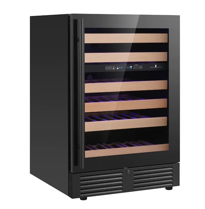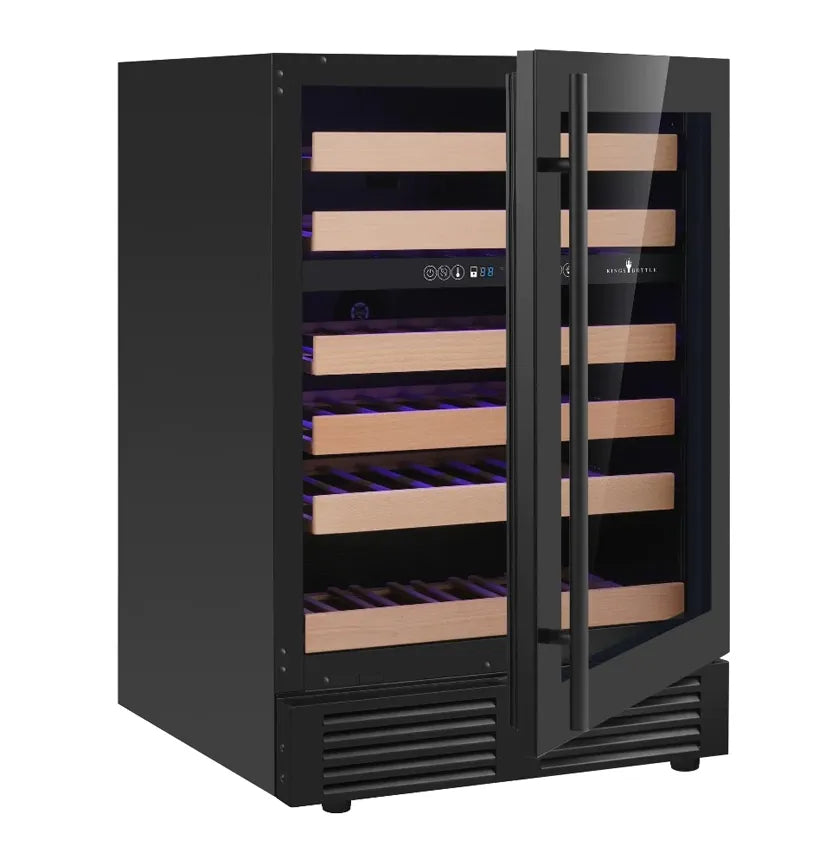 Discover our advanced 24-inch under-counter dual zone wine cooler, designed specifically for wine experts in the US. With its silent operation and Embraco Inverter Compressor, it's 40% more energy-efficient. The two-layer tempered glass door utilizes Low-E glass, effectively filtering UV radiation and minimizing condensation. This luxurious wine cooler can hold up to 46 bottles and accommodates wines with a diameter of up to 3.38″ (86mm). With its sleek design and front-venting system, it's perfect for kitchen cabinets, gaming areas, and home bars. Experience the best cooling for your favorite sips with our premium wine cooler. Install it in the perfect location to elevate your wine storage. KingsBottle USA now proudly offers the KBU145DX under-counter glass door wine cooler.