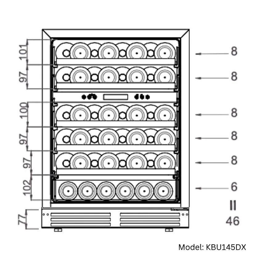 Experience the sophistication of our single zone wine cooler, designed for wine connoisseurs who value both form and function. With meticulous craftsmanship and advanced technology, this fridge is a precise instrument for maintaining and improving the quality of your priceless wine collection. Drawing inspiration from our renowned dual-zone model, the KBU145DX, this wine cooler is a perfect addition to any modern kitchen, upscale bar, or elegant wine cellar. Its low-E glass door not only enhances the aesthetic appeal but also protects your wines from harmful UV rays. The interior is carefully crafted to maximize storage while minimizing vibrations and noise, with high-quality oak shelves to keep your bottles upright and organized.