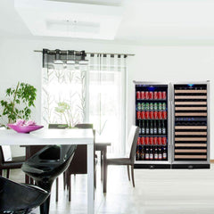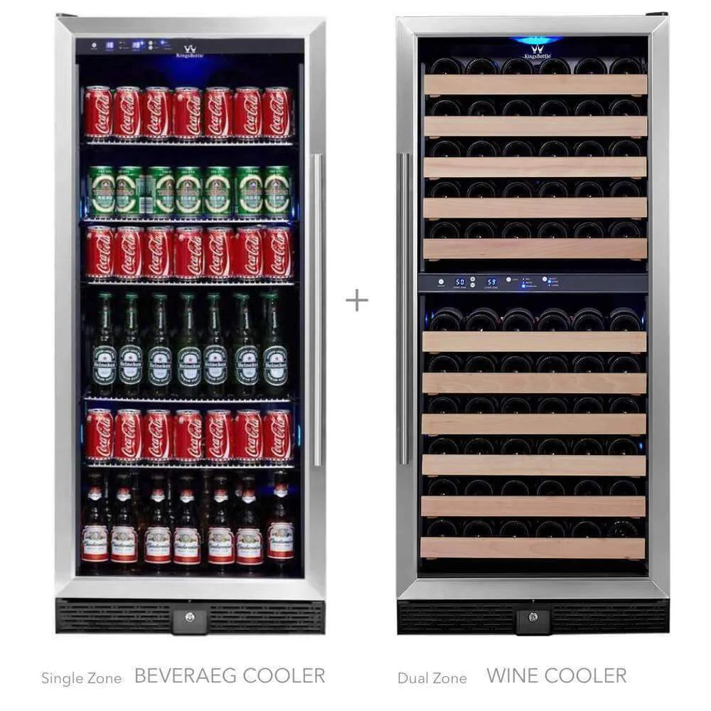Maximize your storage space for both wines and beverages with KingsBottle's 3-zone wine and beer bottle refrigerator combo. Equipped with two units, this set can hold up to 300 cans and 106 standard-sized wine bottles, ensuring that your guests will always have a cold drink in hand. The three temperature zones provide precise temperature control for each type of drink. Choose the regal standards of KingsBottle and never leave your bottles sitting on the shelf without proper refrigeration. Order today.