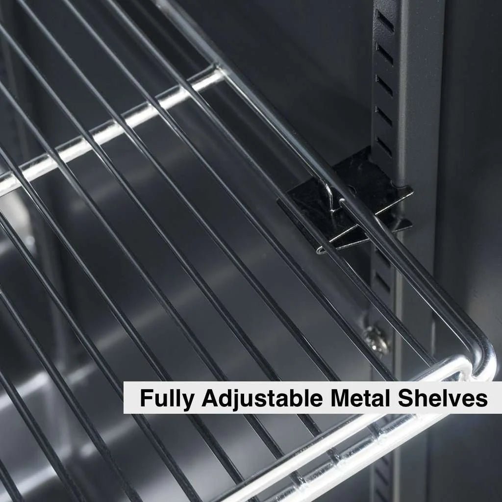 • Shelf Configuration: 5 Chromed Steel Shelves + 12 wooden shelves