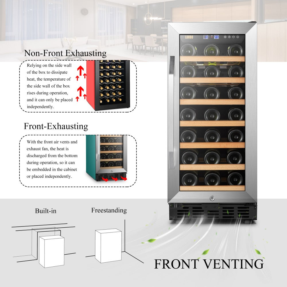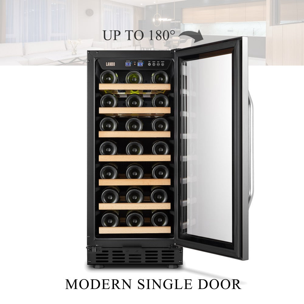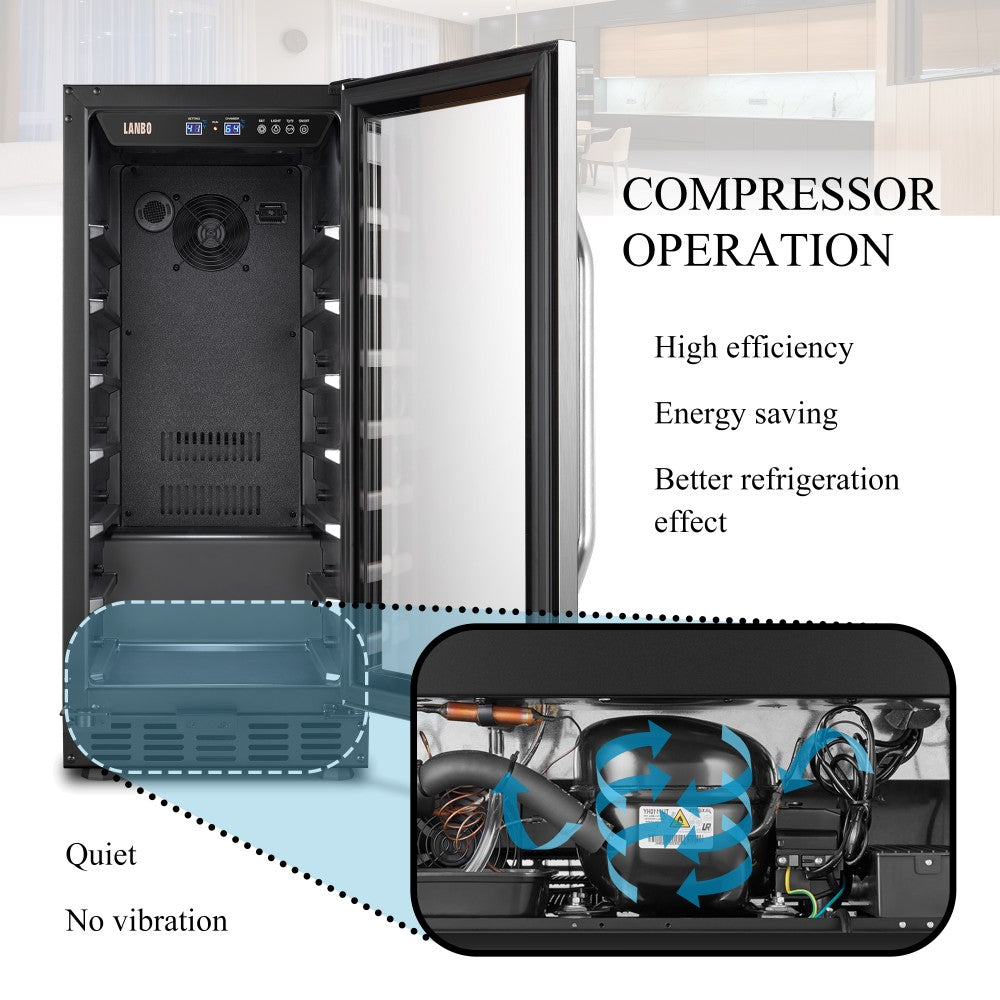 This under-counter, single-zone wine cooler from Lanbo Appliances is perfect for your home, kitchen, or entertainment area. Whether you prefer a built-in or freestanding option, this compact refrigerator can accommodate up to 33 standard 750ml Bordeaux bottles. With its versatile design, the 15-inch wide fridge can be easily installed in any space.