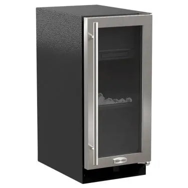 The 15" Marvel MLCP215SG01B Clear Ice Machine with Arctic Illuminice Lighting produces pure, clear ice that chills drinks faster and melts more slowly, enhancing your drinking experience. Its reversible stainless steel framed glass door highlights the Arctic white LED lighting, illuminating the ice even when closed. Recognized as the quietest ice machine available, it includes energy-saving features that reduce water and electricity consumption. The Close Door Assist System ensures energy efficiency by gently closing the door.