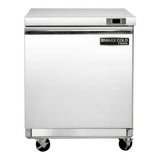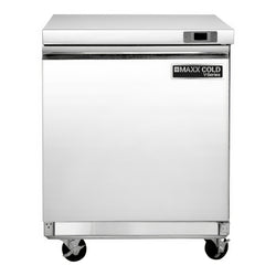 The Maxx Cold V-Series 29 Inch 1 Door Undercounter Refrigerator delivers efficient refrigerated storage while conserving valuable floor space in commercial kitchens. Its durable stainless steel exterior and powder-coated aluminum interior ensure longevity and easy maintenance. With a 7.8 cubic feet capacity, one recessed handle door, and an adjustable heavy-duty wire shelf, it organizes chilled items like produce and meats effectively. Designed to fit under counters, it includes four 3" swivel casters (two with brakes) for mobility and cleaning convenience. Features include a digital control system, LED temperature display, urethane foam insulation, and a 33°F to 40°F temperature range. The built-in condensate evaporator eliminates the need for a drain line. Ideal for various foodservice settings, it comes with a six-month limited warranty.