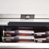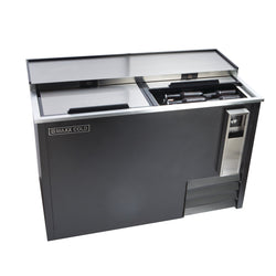 The Maxx Cold X-Series 50” Horizontal Bottle Cooler is designed to keep bottled and canned beverages chilled and within easy reach. With a 14 cubic foot capacity, it efficiently stores a variety of drinks including beer, soda, and water. Its stainless steel interior features LED lighting for clear visibility, while two sliding top lids provide convenient access. Equipped with a built-in bottle opener and cap catcher, this cooler supports high-volume use. The sturdy black steel exterior and rear marine-edged shelf enhance both durability and workspace. Insulated walls and a reliable cooling system ensure consistent temperatures. Mobility is facilitated by four casters, and adjustable dividers help organize contents. Backed by a one-year parts and labor warranty plus a five-year compressor warranty, this cooler is a professional choice for bars and entertainment venues.