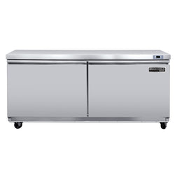 The Maxx Cold V-Series 60 Inch 2 Door Undercounter Refrigerator delivers efficient refrigerated storage while conserving valuable floor space in your commercial kitchen. Its stainless steel exterior and powder-coated aluminum interior ensure durability and easy cleaning. With 18.5 cubic feet of capacity, two recessed-handle doors, and adjustable heavy-duty wire shelves, it organizes chilled ingredients like vegetables, meat, and fruit effectively. Designed to fit under counters, it includes four 3" swivel casters (two locking) for mobility. Features include a digital control system, LED temperature display, urethane foam insulation, and a built-in condensate evaporator requiring no drain line. Operating between 33°F and 40°F, it maintains optimal storage conditions and is backed by a six-month limited warranty. Ideal for restaurants, bars, bakeries, and more.
