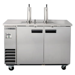 The Maxx Cold X-Series Dual Tower 2 Tap Beer Dispenser is built for robust use, high efficiency, and straightforward cleaning. It supports two kegs with a storage capacity of 14.2 cubic feet (402 L). Featuring two 3-inch (77 mm) stainless steel insulated towers, it dispenses two different beverages simultaneously. Ideal for bars, breweries, catering, and events, its stainless steel exterior and sanitary white powder-coated interior ensure durability and hygiene. Fully insulated with 2-inch CFC-free polyurethane, it maintains optimal temperatures via a forced-air refrigeration system and cooled draft towers that minimize foam. The unit includes a digital temperature display, slide-out condensing unit, locking recessed handles, swivel casters, and an integrated condensate evaporator, requiring no drain line. CO2 tank and regulator are needed but not included. Backed by a one-year parts and labor warranty plus a five-year compressor warranty, this dispenser delivers reliable draft beer service with professional-grade performance.