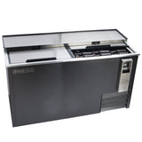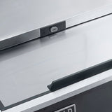 The Maxx Cold X-Series Horizontal Bottle Cooler is designed to keep bottled and canned beverages chilled and within easy reach. With a 17 cubic foot capacity, it efficiently stores a variety of drinks including beer, soda, and water. Its stainless steel interior features LED lighting for clear visibility, while two sliding top lids provide convenient access. Equipped with a built-in bottle opener and cap catcher, this cooler supports high-volume use. The sturdy black steel exterior suits bar environments, complemented by a rear shelf with a marine edge for extra prep space. Insulated walls and doors ensure stable temperatures, and four casters offer mobility. Two adjustable dividers help organize your beverages. Backed by a one-year parts and labor warranty plus a five-year compressor warranty, this cooler is a reliable choice for professional settings.