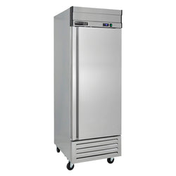 The Maxx Cold V-Series 1 Solid Door Reach-In Refrigerator is ideal for commercial kitchens such as restaurants, cafes, and bakeries. Measuring 27" wide with a 19 cubic foot capacity, it provides ample space for storing perishable items, prepared foods, and beverages. Constructed with a durable stainless steel exterior and painted aluminum interior, it is built to endure heavy use while remaining easy to clean. The unit features a self-closing, locking solid door with a recessed handle and an open door alarm. Three adjustable heavy-duty wire shelves offer flexible storage options. Equipped with a bottom-mounted compressor for easy maintenance and 4-inch swivel casters for mobility, it ensures convenience in busy environments. Temperature is digitally controlled between 34°F and 40°F, displayed on a clear LED panel. Additional features include automatic interior lighting, defrost, urethane insulation, and a condensate evaporator that eliminates the need for a drain line. This refrigerator comes with a six-month parts and labor warranty, making it a dependable choice for foodservice professionals.