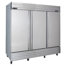 Ideal for use in restaurants, cafes, bakeries, catering businesses and more, the Maxx Cold V-Series 3 Solid Door Reach-In Refrigerator is a smart investment. Offering ample storage space for perishable goods, ingredients, prepared foods and beverages, this commercial reach-in refrigerator measures 81"W and has a storage capacity of 65 cubic feet. Built to withstand the demands of a commercial kitchen environment, it is constructed of a durable, easy-to-clean stainless steel exterior and painted aluminum interior. This reach-in refrigerator has three self-closing, locking solid doors with easy-to-grip recessed handles, and the unit's open door alert beeps when a door has been open for three minutes. Nine adjustable heavy-duty wire shelves let you organize and store food and beverage items efficiently. The unit has an easily accessible bottom mount for cleaning and is equipped with 4-inch swivel casters for easy mobility in your commercial kitchen. The digital control system lets you easily adjust the temperature with the range of 34°F to 40°F (1°C to 4°C), and the LED temperature display is easy to read. This triple-door reach-in refrigerator features automatic interior lighting, an automatic defrost system and urethane foam insulated walls and doors. The unit is equipped with an integrated condensate evaporator; therefore, no drain line connection is needed. Investing in the Maxx Cold V-Series 3 Solid Door Reach-In Refrigerator is a practical and essential decision for businesses in the foodservice industry. Covered by the Maxx Cold Six-Month Parts and Labor Limited Warranty.