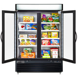 The Maxx Cold V-Series Double Glass Door Ice Merchandiser Freezer provides an attractive and efficient way to display frozen products. Measuring 54" wide with a 48 cubic foot capacity, this commercial freezer features a powder-coated steel exterior and aluminum interior for durability. It includes a bottom-mounted compressor for easy cleaning and two triple-pane heated, insulated glass doors that offer clear visibility without opening. Eight adjustable heavy-duty PE-coated wire shelves maximize display space for frozen meals, ice cream, and other items. Interior LED lighting enhances product presentation, while four casters (two with leveling feet) ensure easy mobility. Digital controls with an LED temperature display maintain temperatures between 0°F and 10°F (-18°C to 12°C) to keep products at optimal quality and safety. The automatic defrost system reduces maintenance, and the illuminated top panel provides a prime area for advertising, making this freezer ideal for supermarkets, convenience stores, gas stations, cafes, and more. This merchandiser freezer is a cost-effective solution for commercial use.