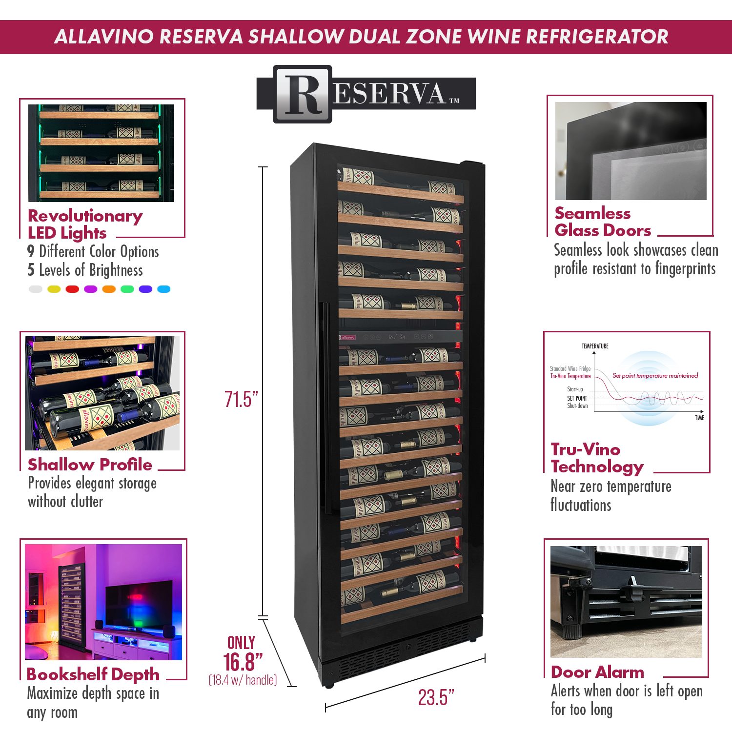 Allavino Reserva Series 67 Bottle 71" Tall Dual Zone Right Hinge Black Shallow Wine Refrigerator with Wood Shelf Fronts