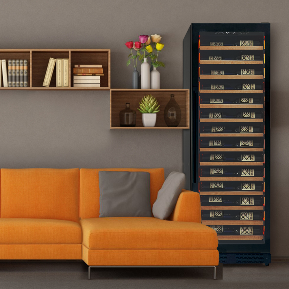 The  Allavino Reserva VSW6771S-1BR-WD stores up to 67 standard bottles behind an attractive black metal door. The specially-coated glass blocks damaging UV rays from affecting your wine while allowing the bottles inside to be clearly seen on their wood-front shelves. The lighting inside is customizable, able to be switched to one of 7 colors or set to cycle through all. Store any type of wine at their preferred temperature, and the Tru-Vino technology inside will hold the temperature steady at your chosen thermostat setting.