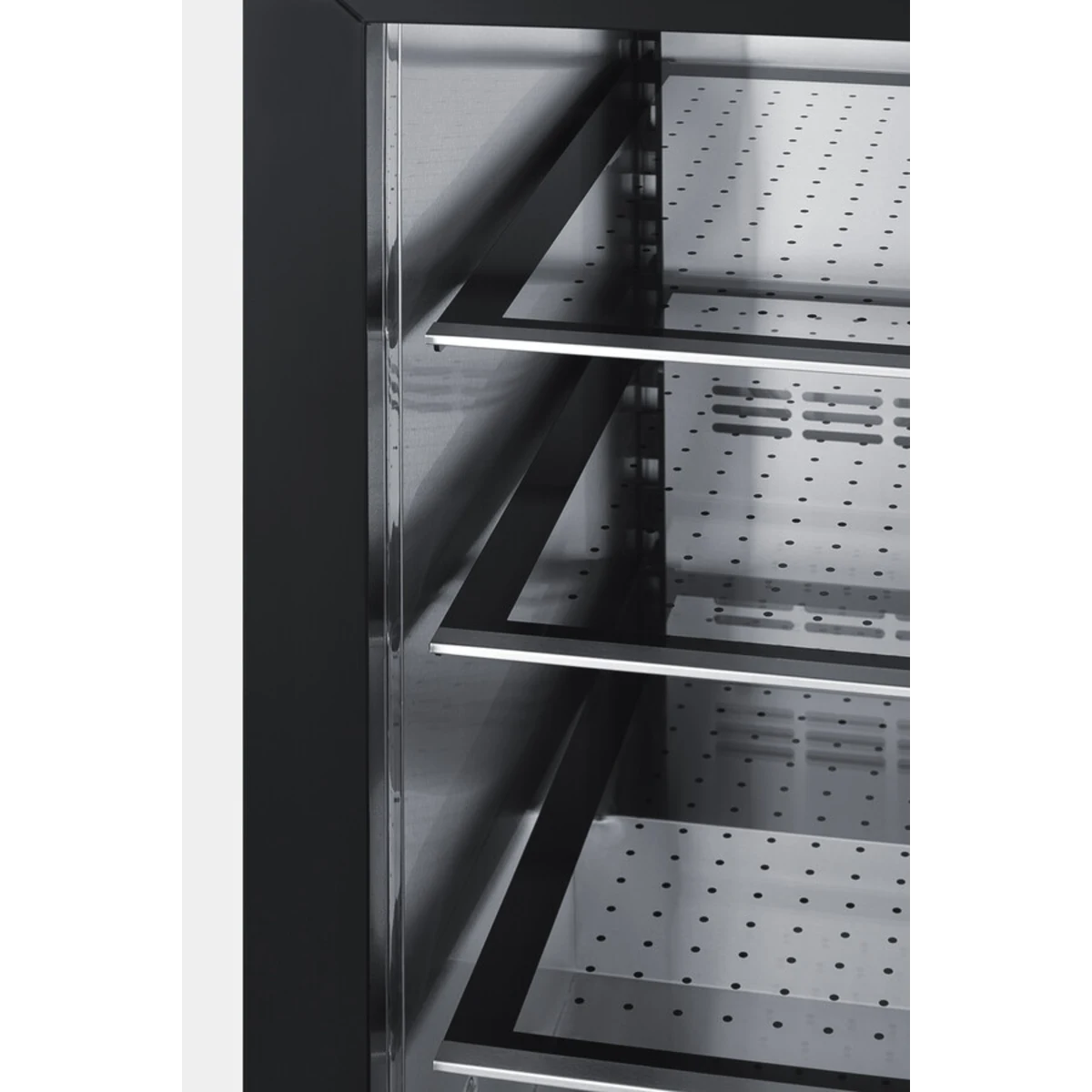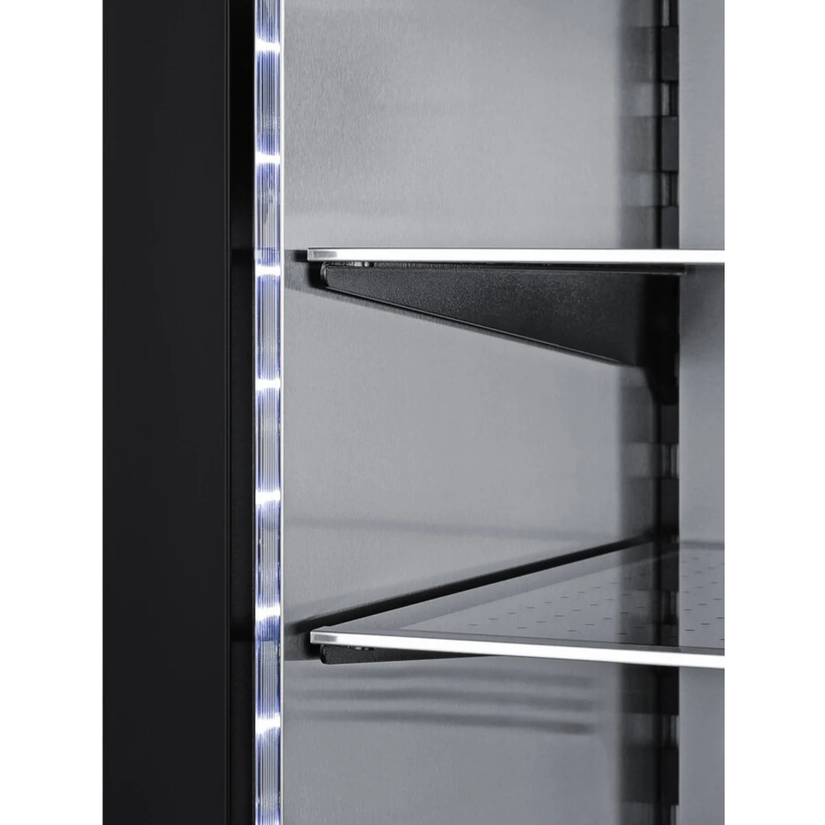 The ASDG1521LHD boasts robust stainless steel interior construction with fan-forced cooling technology for optimal temperature management. Dual LED strips with adjustable brightness provide customizable display illumination, while the commercial-grade cantilevered glass shelving system accommodates various storage needs.