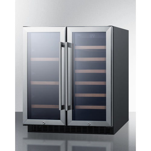 The Summit Appliance SWBV3071 is a versatile built-in wine and beer cooler that can also be used freestanding. It features two stainless steel trimmed glass doors that open with a unique French door swing and come with factory-installed locks and professional handles. The front locks are keyed for added security for both compartments. The sealed back design adds convenience for cleaning.