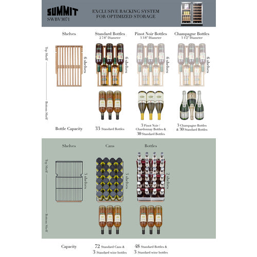 Store up to 33 standard Bordeaux-style wine bottles in the right section and up to 72 8 oz. cans or 48 12 oz. bottles in the beverage section. To accommodate wider Burgundy-style wine or champagne bottles, you can remove every other wine shelf