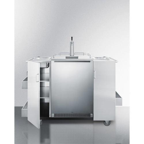 SUMMIT's CartOSBC transforms outdoor entertaining with its premium stainless steel design that integrates sophisticated beer dispensing capabilities. This expansive 61" unit creates a complete outdoor culinary station featuring three exterior shelves and secure magnetic-locking compartments with elegant towel bar handles.