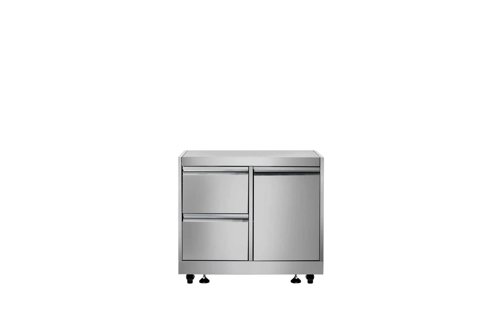 Two storage drawers and a bottom storage cabinet offer extra space to keep your grilling essentials, chef towels and cleaning supplies