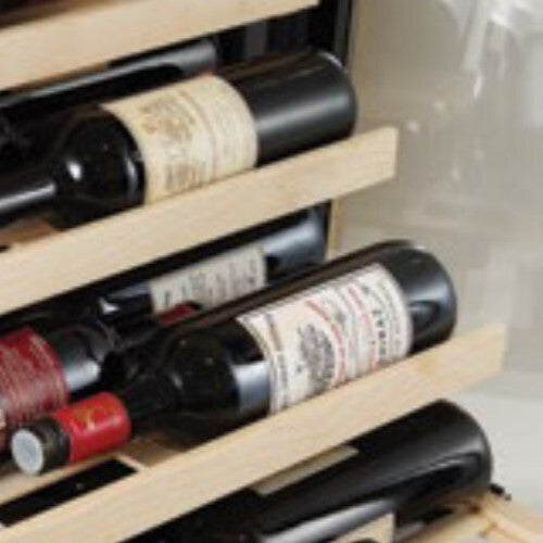 • Gliding Wooden Shelves – Smooth, easy access to bottles while preventing vibrations that could disturb sediment.