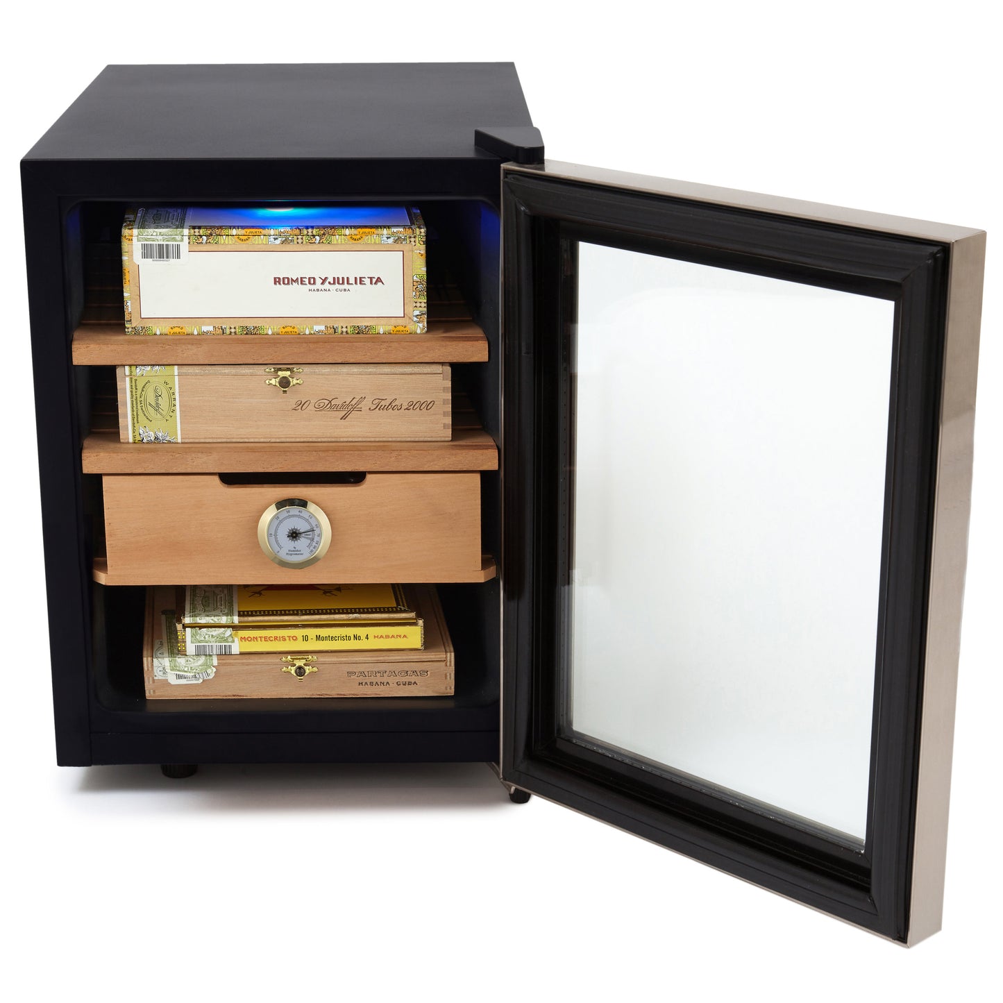 Whether you're a seasoned cigar expert or a casual smoker, the Whynter CHC-120S 1.2 cu. ft. Electric Cigar Cooler Humidor is the perfect solution for keeping your cigars fresh and protected from potential harm. This state-of-the-art humidor is specifically designed to store and age cigars at the optimal humidity range of 62% to 75% and room temperature. Equipped with a humidification tray and elegant analog hygrometer, this humidor ensures that your cigars are stored in the ideal environment. Its thermoelectric cooling system also minimizes drying and discourages pests that may be present in tobacco leaves. With two Spanish Cedar flat shelves and a spacious drawer, the Whynter CHC-120S not only helps maintain humidity but also emits a pleasant aroma and repels harmful insects. Not just a storage system, this humidor serves as an elegant display for your prized cigar collection.