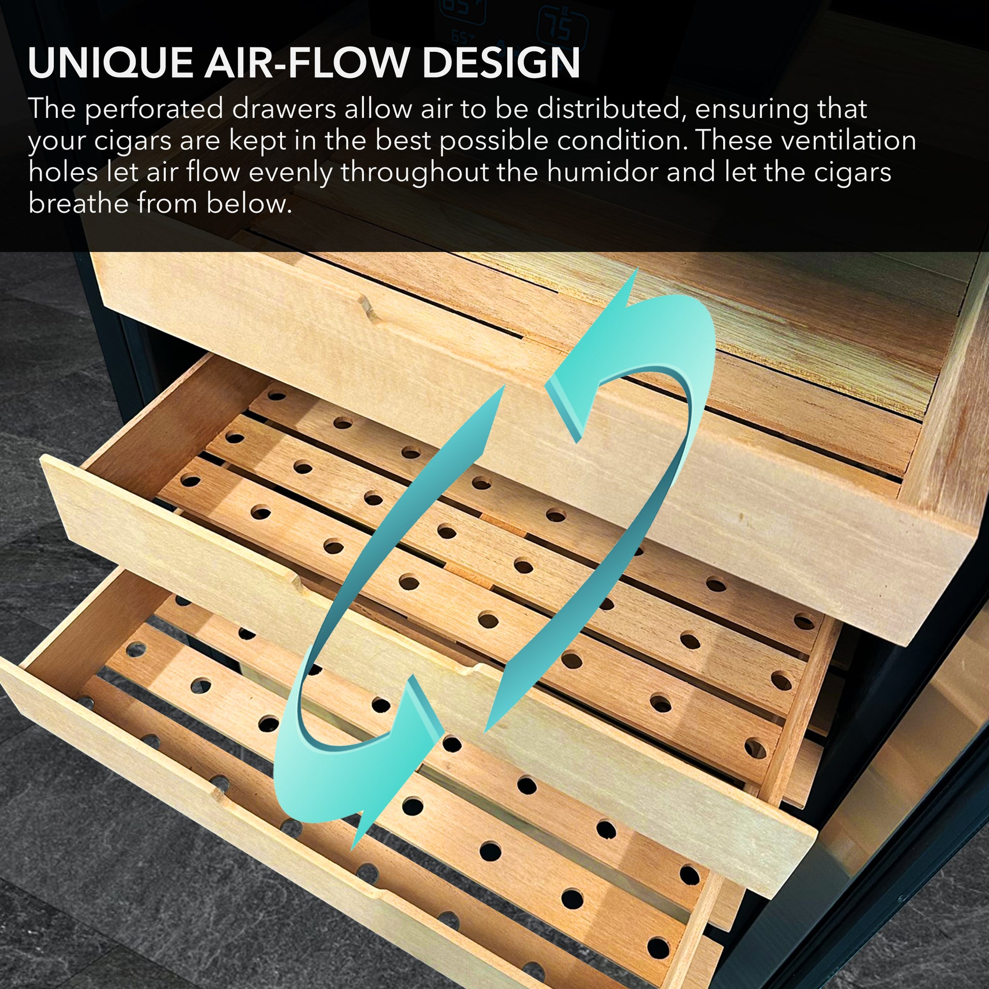 • Features a Spanish Cedar half shelf, wooden trim, and 3 spacious drawers. This wood helps maintain humidity and emits a light aroma to complement the scent of the cigars while also repelling pests