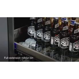 Keep wine, beer, soda, juice and more on hand and ready to drink in this Full Size Wine & Beverage Cooler. Featuring Full-Extension Wood Racks for bottle storage, a stainless steel Full-Extension Rollout Bin for easy access, vertical LED light strips in three colors and four light levels, an illuminated control panel, and an updated kickplate with built-in lock. Also boasts an auto-illuminating function that sets the lighting to the highest brightness level when the door opens for greater visibility.